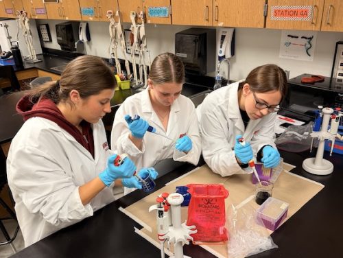 Kennedi Wyman, Riley Farrel, and Mikayla Mellow performing a Western blot to confirm Parkinson’s Alpha-Synuclein’s molecular weight for pre-flight trials.