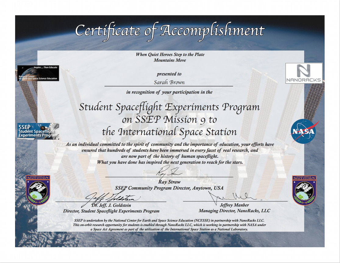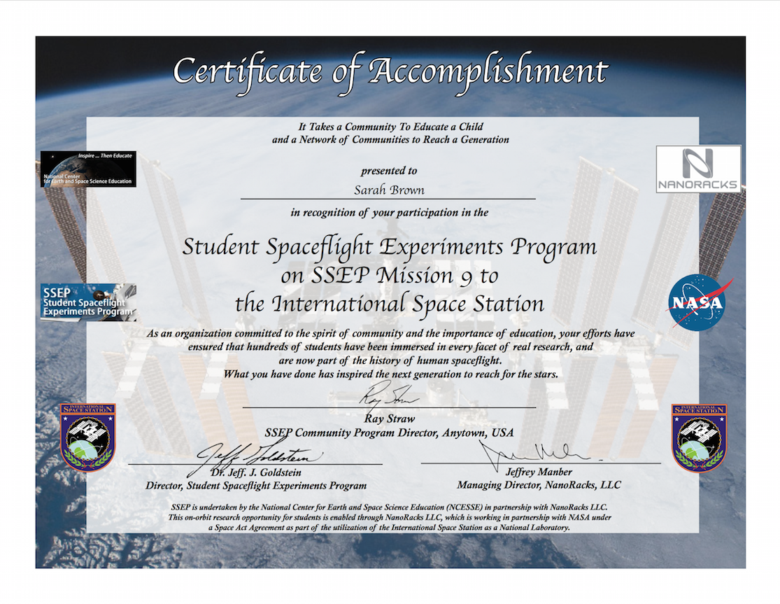 The certificates are provided to the Community Program Director as a PDF file. They are ready to be printed in color by the community, and given to teachers and administrators, local partner organizations, and individuals that have participated in the program. The certificates include imagery, logos, and ISS insignia, as well as electronic signatures for Dr. Jeff Goldstein, SSEP Director, and Jeffrey Manber, Managing Director of NanoRacks, LLC.